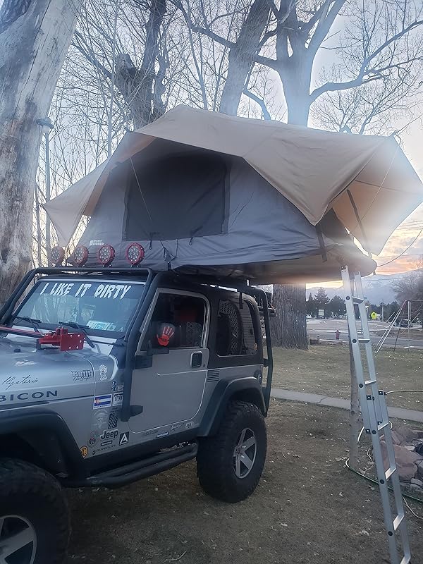 Before you buy a RTT, please know what you want before buying something you might regret it later down the road.Super light Roof Top Tent (RTT) and the lightest compared to the rest out there. And that’s THE main reason why I bought this. I’m 5’3” and somewhat strong, not what I was in my 20’s, and want to be able to mount and dismount the tent by myself. Imagine carrying a 115+ lbs RTT in the weirdest angle or position possible? This thing is sub 90 lbs.I live in Southern California and anything 400 miles from here have mild weather throughout the seasons. It doesn’t drop below 0 or higher than 115 degrees. With that said, I’ve been in weather between 40-114 degrees with this tent. The tent holds up very well with the awnings in place, even with moderate winds ~20 MPH. Scary as hell with the winds howling all around you, but it’s sturdy.The fabric is a “special” Oxford tent fabric 400D and can withstand most things. I stormed through wet weather with no issues at all. The insulated aluminum base is solid, but it does get cold in colder nights. It has lots of zip up windows with another layer of mesh windows to allow fresh air to cycle throughout in those hot summers. There’s also a top vent to circulate hot air out too. Not sure if this would hold up in snow.It comes with a 2 inch covered mattress that’s actually comfortable to lay on throughout the day. Just keep in mind that the mattress is meant to be smaller than the interior of the tent. Simply push the mattress all the way down to the other end of the ladder so that the empty space can stow your bags, shoes, or whatever.There is a bit of prep and setup you need to do before mounting it to your vehicles load bars. EVERYTHING* is included!!!Take the tent out of the box has got to be the hardest thing in this setup. If you have room indoors with carpet, it’s easy. I was working outside where I didn’t want to slide and ruin my new tent on the the concrete patio floor. So I got creative and ripped the cardboard box apart at the nailed down seam. Don’t use a blade! It will cut through and damage your tent, so I used my bare (bear-like) hands to rip it apart. Once open, you’ll find all the parts. I placed the tent on a wooden table covered with a blanket. Just follow the well documented instructions included in the packaging.The 2 modifications I did in my application was to add holes to secure the ladder in the closed position and to have longer mounting plates for my load bars.The ladder in the closed position simply allows the ladder to slide out easy, maybe too easy. So I simply marked the holes in the closed position and drilled holes. Now whenever it’s closed, it’s locked.I have a Land Rover LR4 and the load bars are super wide, about 3 inches wide. The included mounting plates can only accommodate about 2 – 2.5 inches. So I went to Home Depot to get a 1/4” steel plate by 2 feet long. I measured, cut out 4 pieces, drilled holes, and spray painted them with rust-oleum rust resistant paint. The bolts included are fairly long and works perfectly.I also bought the annex, tent shower skirt, or whatever you want to call it. It attaches the aluminum extrude without any issues.